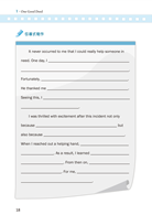 記敘自己所曾經做過的一件善事時,可依循 5W+1H(who, when, where, what, why 以及 how)的原則,思索整起事件發生的經過,將事件中的人物、發生的事、時間、以及地點交代清楚,最後再具體明確地刻劃自身的感想,給予文章一個完美的結論。