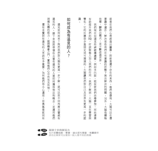 將遠見和腦科學結合在一起,是一項不尋常的嘗試,但最有趣的觀點經常是由許多想法相互激發而來,我希望這次也是如此。在接下來的章節中,我相信你會獲得一些驚奇及嶄新的觀點。