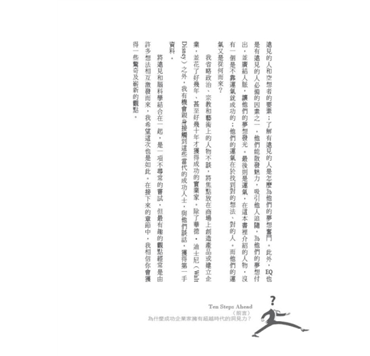 舉例來說,賈伯斯究竟是如何將一九八五年被驅離蘋果電腦的屈辱,轉化成十三年後的勝利回歸,為世界帶來iMac、iPhone、iPad 等產品?理查‧布蘭森又是怎麼將公司從唱片銷售轉成唱片製作,再搖身變成航空公司以及保險公司的老闆,使得要賺進一億美金看來輕而易舉?是怎麼樣的運氣、天賦和遠見,使得小貝瑞‧高迪(Berry Gordy Jr.)建立摩城唱片;而安德魯‧葛洛夫(Andrew Grove)又如何在美國西岸建立了英特爾(Intel)?換句話說,他們是怎麼樣領先我們十步之遙?這個叫做遠見的天賦究竟從何而來?