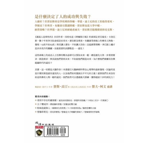 其實,這一切都是大腦作祟!本書援引大腦神經科學及心理學的最新發現,討論究竟是什麼因素造就有遠見的人,以及他們如何發展出不平凡的力量!就算我們生來沒有如這些傳奇人物一般的遠見,我們依然可以透過後天訓練,獲得超前十步的洞見力!