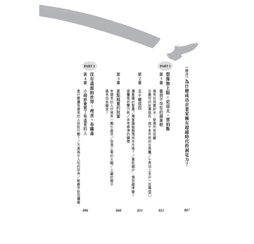 過去二十五年來,我有機會和理查‧布蘭森或史帝夫‧賈伯斯等最具遠見的企業家們面對面接觸。和這樣的人相處是什麼感覺?我想我會用「好得出奇」來形容。猛然發現自己望著他們,心裡油然而生某種程度的敬畏,心想他們究竟是怎麼做到的。尤其是那領先眾人的遠見,有時真令人費解。換句話說,他們是怎麼樣領先我們十步之遙?這個叫做「遠見的天賦」究竟從何而來?