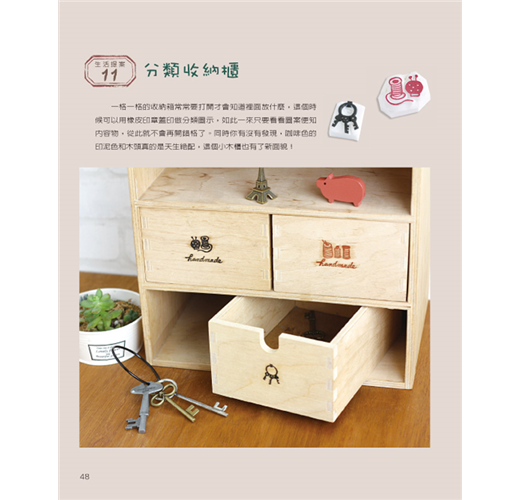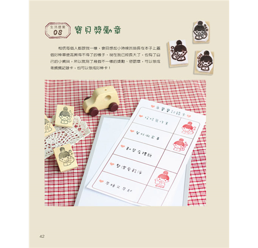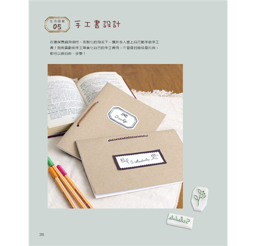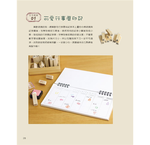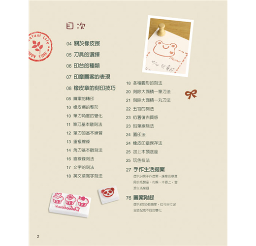 《橡皮章的生活提案》為了讓大家更有效率地進入橡皮擦印章的手刻世界,本書從橡皮擦和刀具的選擇、印台種類介紹和DIY、橡皮章的刻印技巧等皆有詳盡的介紹。熟練了基本雕刻方法之後,就可以運用在各式各樣的生活小物上了,例如行事曆、信紙、書籤等紙製品,也可印在衣服、袋子、緞帶等布製品上,甚至可以印在其他材質的物品上,讓你的生活更加多姿多彩。本書集結了約550個圖案,再搭配簡單有趣的生活提案,豐富你的每一天。除此之外,你也可以將圖案或文字混合搭配做複合式表現,更可以自由繪畫創作,希望藉由橡皮章刻印讓你找到更多幸福與美好!