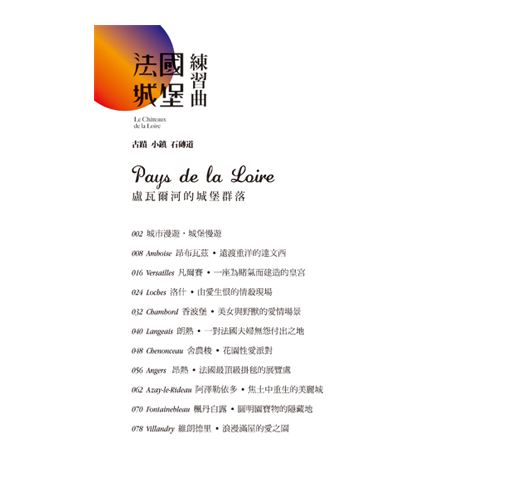 法國中西部的盧瓦爾河流域(Pays de la Loire)共有規模大小不一約50座城堡,堪稱是主導法國文明與權力中心的角力場,作者蘭花在本書中介紹了其中20座在法國歷史上占有重要地位的古堡,與讀者分享這些城堡過去的光榮璀璨,以及各個城堡間環環相扣且有趣特別的旅遊記趣與歷史故事。