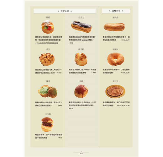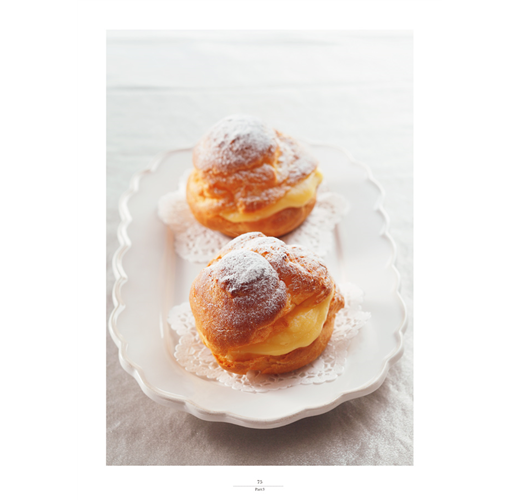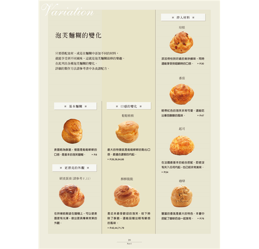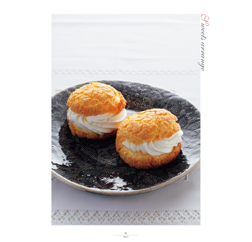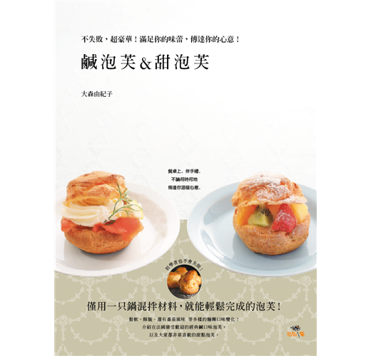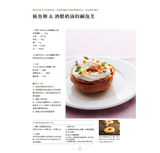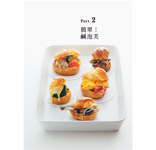 書中也介紹很多成熟風味的甜泡芙。除了常見的卡士達和鮮奶油泡芙之外,還有泡芙餅皮的豪華甜點;或是活用泡芙餅皮的食譜,請大家一起體驗享受甜鹹風味的無限樂趣。
