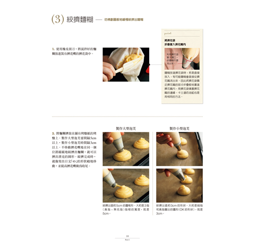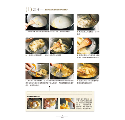 在「鹹泡芙 & 甜泡芙」書中,基本麵糊有非常詳細的圖解步驟及做法,更細分為: