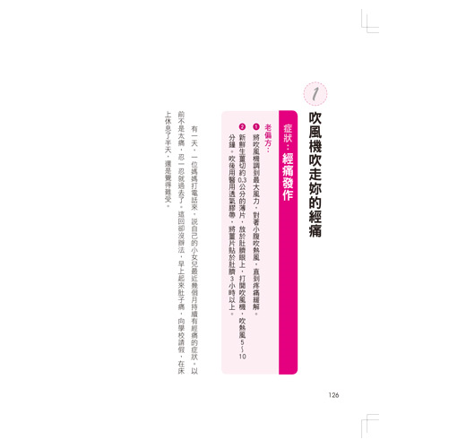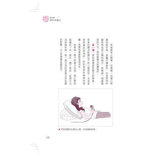 家裡雖然有止痛藥,但媽媽一向對西藥的副作用比較畏懼,盡量不讓她吃,於是想問我中醫有無迅速止痛的偏方,我則教了她一個最簡單的方法:用吹風機治經痛發作。