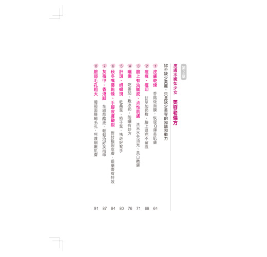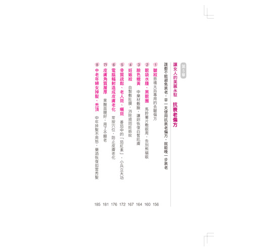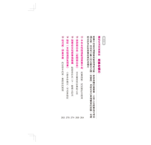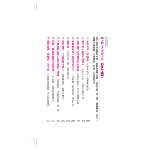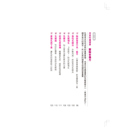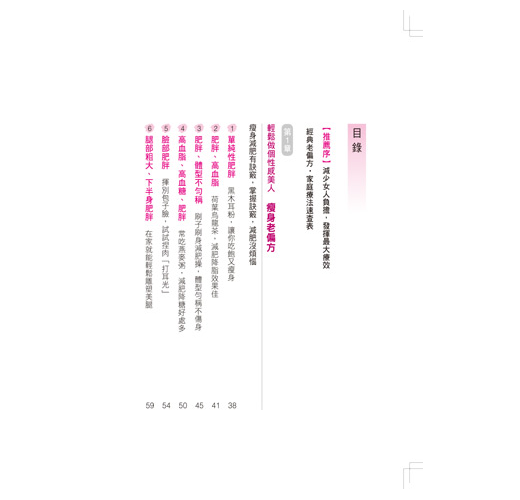 此書共分為10章,依次探討瘦身、美容、豐胸、婦科、抗衰老、筋骨、孕產、心理和生活上所遭遇的問題及病症。