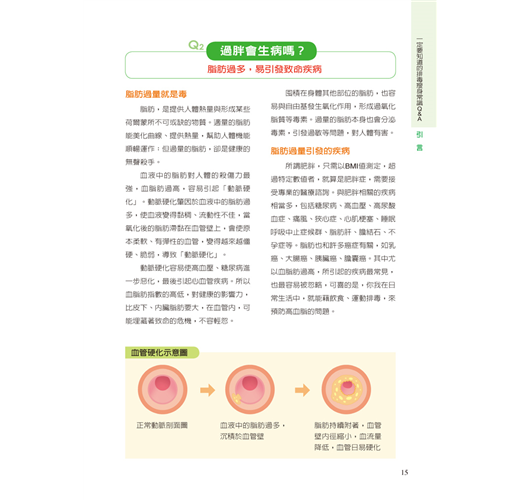 所謂肥胖,只需以BMI值測定,超過特定數值者,就算是肥胖症,需要接受專業的醫療諮詢。與肥胖相關的疾病相當多,包括糖尿病、高血壓、高尿酸血症、痛風、狹心症、心肌梗塞、睡眠呼吸中止症候群、脂肪肝、膽結石、不孕症等。脂肪也和許多癌症有關,如乳癌、大腸癌、胰臟癌、膽囊癌。其中尤以血脂肪過高,所引起的疾病最常見,也最容易被忽略,可喜的是,你我在日常生活中,就能藉飲食、運動排毒,來預防高血脂的問題。