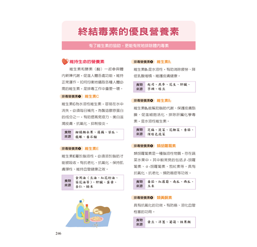 現代人三餐不正常、飲食不均衡,無法攝取最完整及均衡的營養素來清除體內毒素,因此需要針對自己的營養需求來補充健康食品。如抗氧化營養素(捕捉體內的自由基),維生素C、E、硒、類黃酮素等。