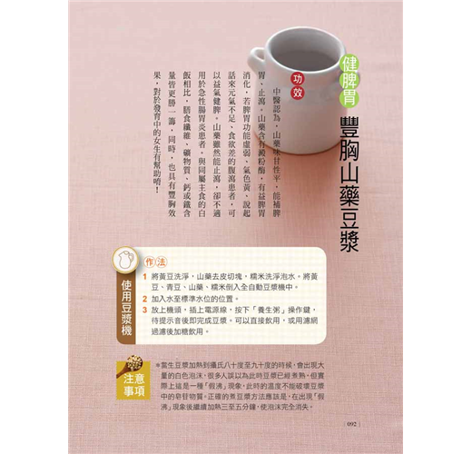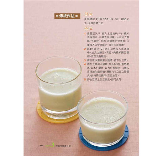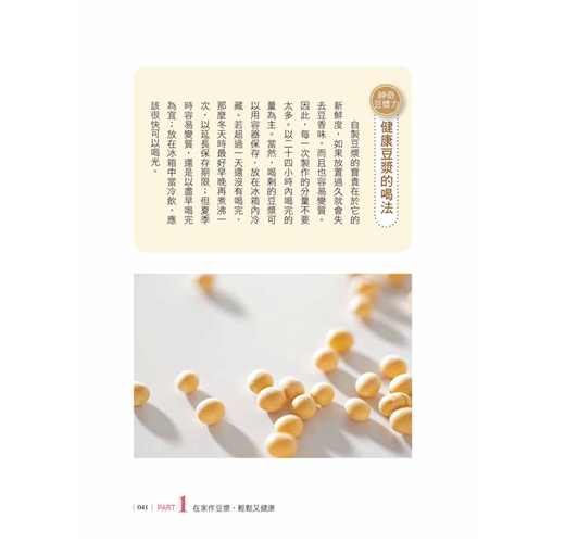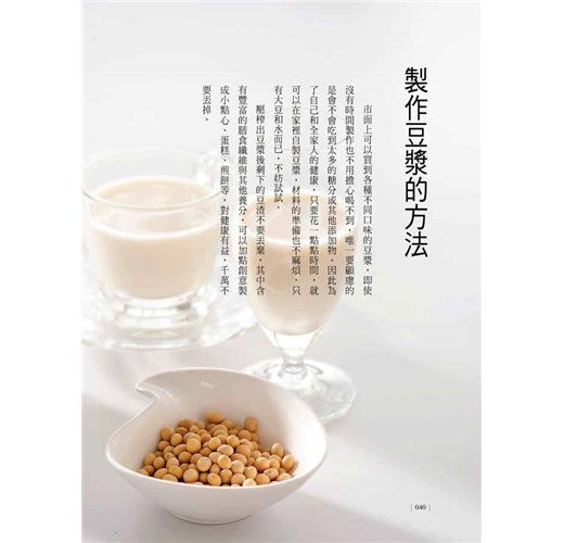 這本書,除了和大家分享豆漿的好處、暸解豆漿的營養價值外,更教大家自己在家做衛生、質純的豆漿,如果你想喝豆漿,又怕喝多了會膩,也擔心每天都要去買豆漿很浪費錢,不妨照著書,自己做做看吧!你會發現,自製好喝又濃純的豆漿一點也不難。