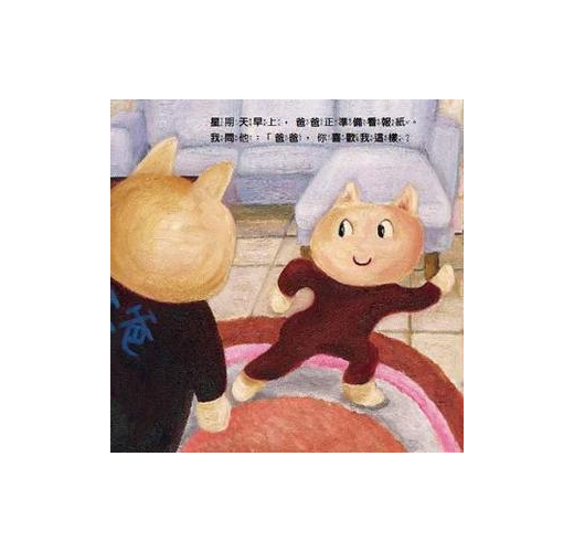 星期天上午,貓爸爸想要看報紙,「不甘寂寞」的小胖貓卻頻頻「出招」,和爸爸玩起「我問你答」的遊戲──這恐怕是許多家庭都曾出現過的情景。小孩和大人間沒話找話講的言語趣味,不僅逗人發笑,也傳遞出親子互動的真實情感。
