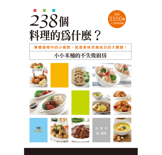 「238個料理的為什麼?小小米桶的不失敗廚房」每道都有材料、做法,更詳細列出料理份量、關鍵的重點、注意Note,還有小米桶的貼心建議,讓您100%精準掌握所有步驟,美味料理大成功!更依菜式分為:<Part 1>豬、牛、雞肉美味更加分的83個關鍵重點---包括:全雞、雞腿、肉絲、雞塊、豬腳、五花肉塊、排骨、牛腱、牛腩、絞肉…等不同部位的關鍵重點,輕鬆變化應用23道菜餚。<Part 2>海鮮、蛋、豆腐鮮嫩嫩上桌的77個必學技巧---包括:全魚、魚片、魚塊、蝦仁、蝦球、蝦泥、蛤蜊、蚵仔、螃蟹、透抽、蒸蛋、蛋皮、豆腐…等,不同種類處理的必學技巧,實際應用28道菜餚。<Part 3>蔬菜、飯麵、湯輕鬆零失敗的78個精準訣竅---包括:菠菜、絲瓜、茄子、苦瓜、小黃瓜、番茄、芋頭、蓮藕、乾香菇、煲飯、炒飯、粥、蛋包飯、米粉、麵線、麵條、麵團、濃湯、羹湯、煲湯…等,各種實用的精準訣竅,應用變化24道菜餚。