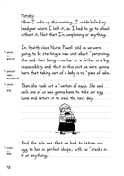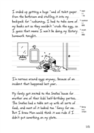 仔細觀察這本書的編排,發現這本書能成為女兒第一本完整讀完的雙語書並非偶然,故事情節引人入勝當然是主因,但編輯設計的用心,也讓讀者的閱讀過程更加順暢:仿手寫的英文字體吸引女兒從英文開始閱讀,書中的漫畫和書頁旁的單字註解幫助她大部分的時間都能順暢的往下看,實在不懂的地方,也可以輕易找到中文版標示的同一書頁,解決心中的疑問之後再翻回英文版繼續看,而中文版的翻譯,除了細心做了文化知識的註解,許多難以翻譯的文字遊戲也費心加以轉換,讓女兒讀完英文後,為了比較中文版和英文版哪一個比較好笑,還能興致勃勃地把中文版也從頭看了一遍。