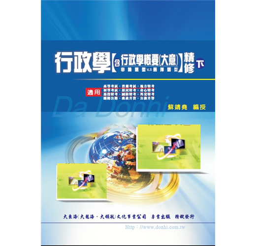 由大東海名師團隊蘇靖堯老師親自編授,延續了行政學含概要大意精修(上)中的基礎概念,配合「實力增強補充」將行政學之內涵更加延伸,在理論基礎之下讓您的行政學概念更深更廣,搭配上「考前重點強迫記憶整理」與「選擇模擬考題觀摩整理」除了獲得快速且百分之百的學習效果,更能增強您面對考試時的應變能力,絕對會是您在邁向公職路上的好夥伴。