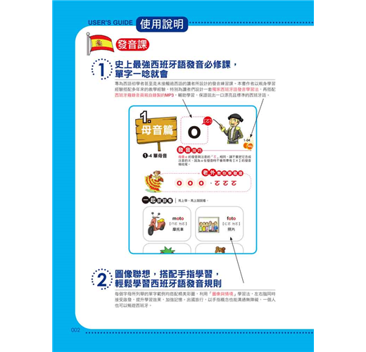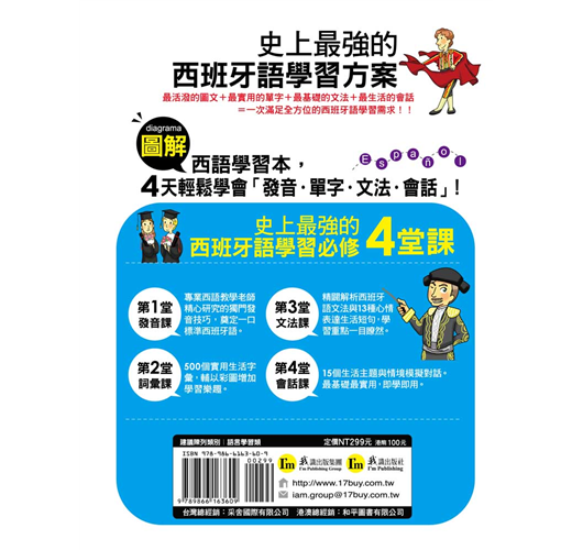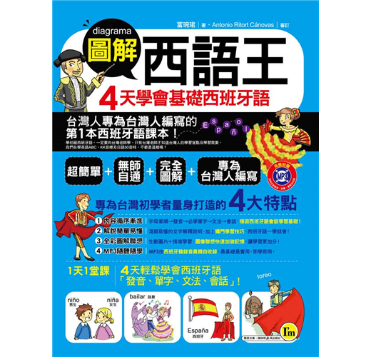 「圖解」的概念不僅可增加其學習興趣,並可打造無壓力輕鬆學習西班牙語的氛圍,真的只要4天就可以同時學好西班牙語「發音、單字、文法、會話」。
