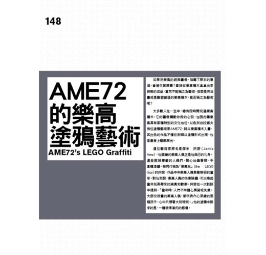 不管你是個有牌的正宗阿福,或者只是深情懷念著家中那盒塵封已久的積木;約翰‧拜區特爾和喬伊‧曼諾,將帶你經歷的不凡旅程,會讓你想要重拾這些小方塊,組合個什麼厲害的東西來瞧瞧!本書收錄樂高認證積木大師納善‧沙瓦亞(Nathan Sawaya)以樂高積木為創作媒材,利用繽紛多彩的積木方塊,創造無限驚奇,堆疊出各種不可思議的藝術作品,以及多位樂高創作藝術家的訪談。
