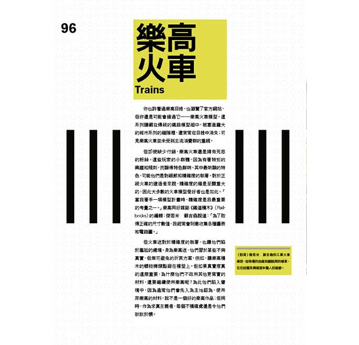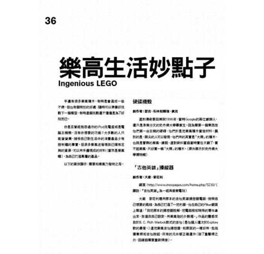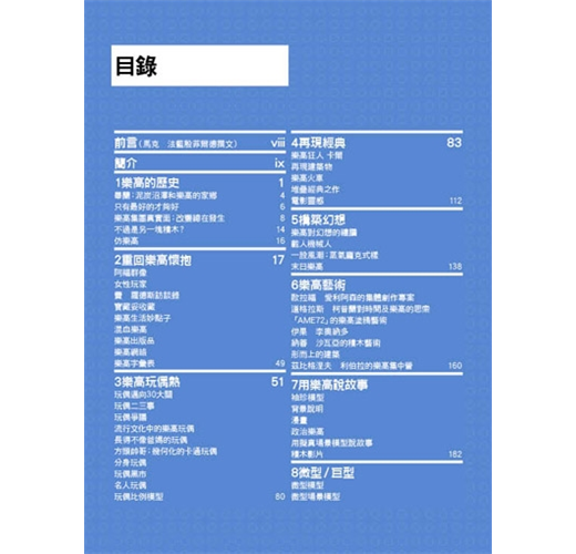 一頁又一頁全彩的精美圖片,呈現樂高社群富有創意、又複雜的精巧模型:一比一的劍龍、微型的洋基球場、22英呎長的二次大戰船艦、動腦機器人系統打造的巨型西洋棋組,還有可以用遙控器控制的爪哇沙戰車(裡面還有會動的輸送帶)!這些模型讓人讚嘆連連。本書還會帶你參觀樂高年會,樂高玩家們就是在此齊聚一堂,聯繫感情並展示作品。最後,你會發現樂高也有嚴肅的一面,可以拿來用在治療上、用來製作產品原型,或是凝聚團隊向心力。