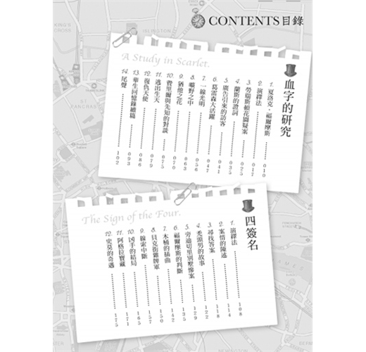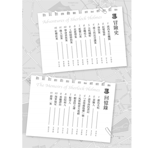 《福爾摩斯》系列共包含了四部長篇、五十六則短篇。四部長篇分別為《血字的研究》、《四簽名》、《巴斯克維爾獵犬》、《恐怖谷》,五十六則短篇分別歸入《冒險史》、《回憶錄》、《歸來記》、《最後致意》、《新探案》;全系列共分大九章節。本書忠於原著的排序與分冊,並按照歷史上的出版年代排列,是最正統、也最具象徵意義的排法;同時,標註了重點提示訊息、插圖,讓讀者也能享有最原汁原味的解謎樂趣。