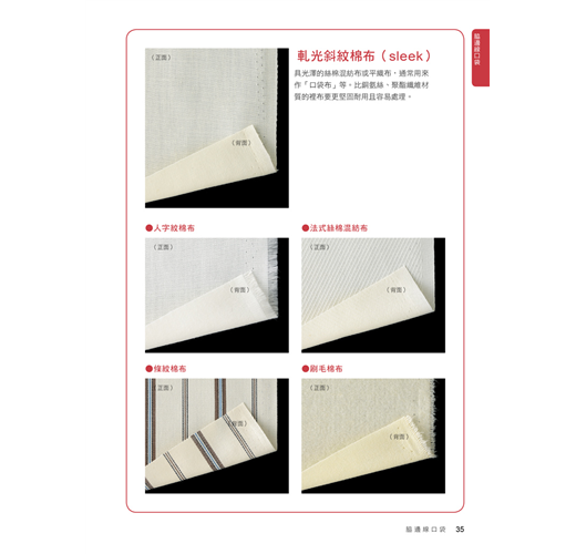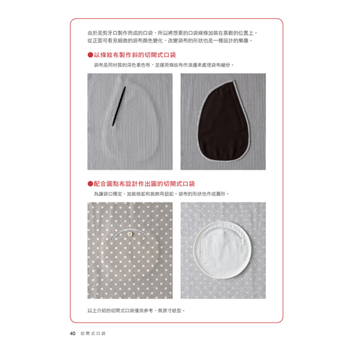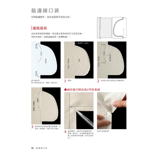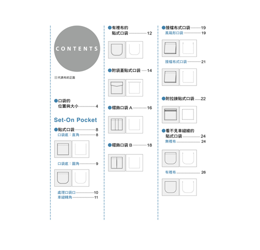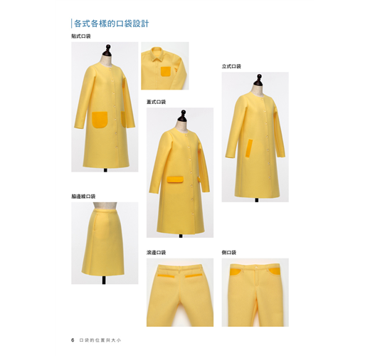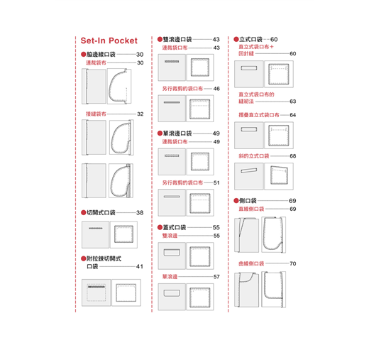 書中介紹了基本的貼式口袋、脇邊線口袋、切開式口袋;也有屬於變化款的側口袋、褶飾口袋、接襠布式口袋、滾邊口袋……等。簡單的款式只要再加上拉鍊、滾邊、袋蓋、褶子,或者形狀稍微變化一下,就馬上有了不同的風貌!