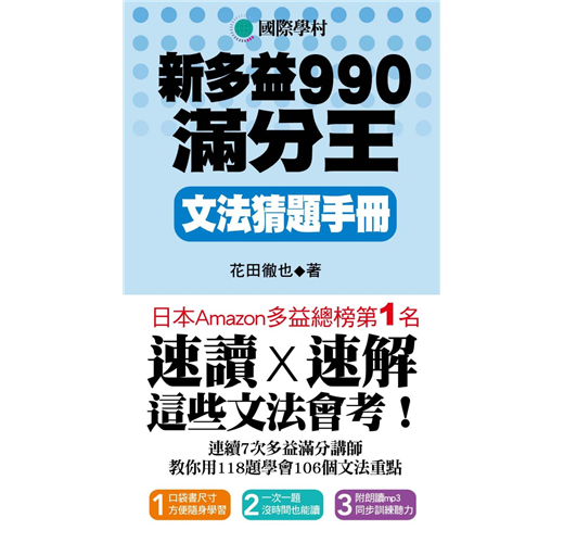 本書「文法猜題手冊」由連續獲得7次多益滿分的補教名師花田徹也撰寫,集結歷屆應考經驗,用118道模擬試題,整合所有必考文法重點,並且針對每一題的文法與解題策略詳細說明,絕非一般三言兩語、輕描淡寫的多益參考書可比擬。參考書+文法書二合一,讓你在做模擬試題的同時,不知不覺學會106個多益必考文法重點,不用拉拉雜雜學太多!隨書附贈試題朗讀mp3,不但能幫助記憶,更能訓練聽力,絕對是市面上最物超所值的多益文法書!