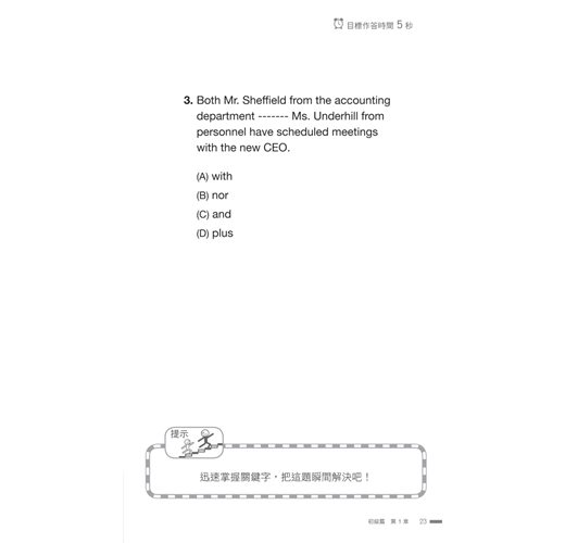 在多益測驗中,除了英文能力之外,更重要的是快速作答的能力。如果不能在限時之內做完題目,英文能力再好都是枉然!花田老師根據每次參加多益考試的經驗,將多益文法考題分為15類,並且將各類試題依照性質分為「文意優先型」與「句型優先型」兩種。快速解題的祕訣,在於先看選項。選項之間意義相近、詞性不同的時候,就表示要採用「句型優先型攻略法」,不必細讀或翻譯,看到句型中的關鍵字,就能瞬間作答!書中每一題都加強解說快速解題策略,讓你學會5~20秒解決一題的技巧,考試時不慌不忙、輕鬆做完所有題目,成績自然大幅進步!