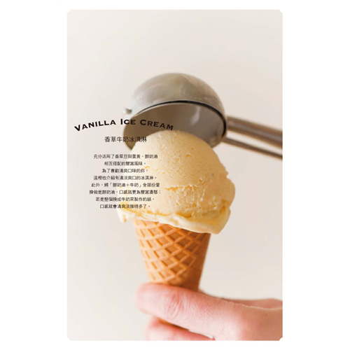 如濃醇的美式牛奶冰淇淋,先教基本款的「香草冰淇淋」,變化款則有「櫻桃彩帶、蘋果肉桂起司、提拉米蘇、水蜜桃優格」等等精采的口味。