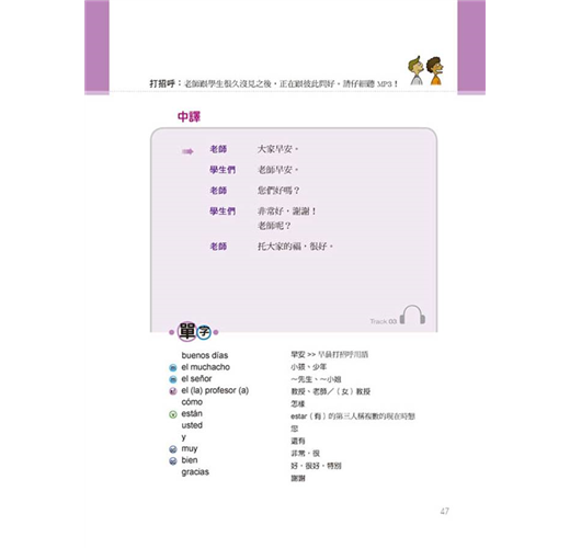 第三單元開始正式課文,這個部分分為機能性分明的20課,從最初的問候、詢問時間、詢問日期、指示代名詞的使用、上街購物、交際聊天、撥打電話等生活實用主題課程。循序漸近的學習,讓你能像爬階梯般地,一步一步地穩固西班牙語能力。