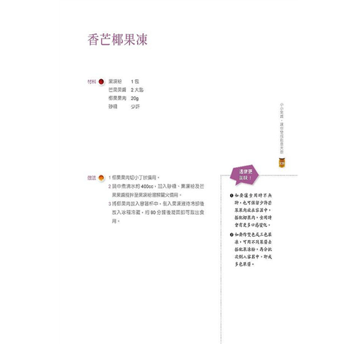 本書除了教你做基本款的明星果醬之外,還有美到不行、可當做禮物送人的粉色果醬。想嘗試與眾不同果醬風的讀者,也可學到如何製作超綺麗的「雙色夢幻果醬」。