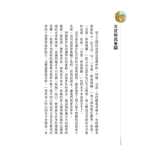 情人之間的話語是很微妙的。同樣一句話,有時聽起來傷人,有時聽起來卻很貼心。比方這一句:「其實,與我無關。」情人請你幫忙餵狗,你說:「其實,與我無關。」對方必定認為你已失去熱情。情人興高采烈與你分享他的成就,你說:「其實,與我無關。」你們差不多該談分手了。