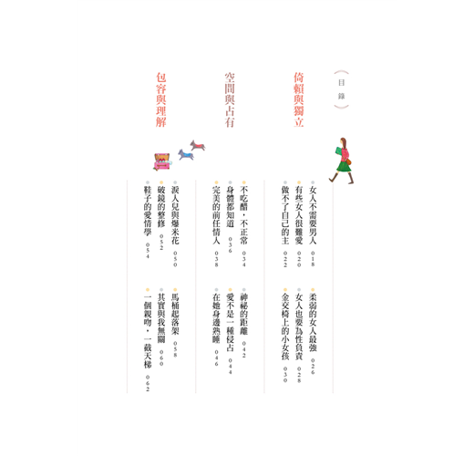一直在旁邊沒說話的大紀突然點頭,對我說:「我明白。」他轉頭對安妮說:「我們很習慣以愛為名,要求掌握愛人的每一個生活細節與全部世界,如果不能如願,就會覺得沒有安全感,把自己和對方都弄得很痛苦。」安妮有點為難地說:「可是,愛一個人不就是愛他的全部嗎?」大紀笑起來,過了片刻才問安妮:「如果他的全部中,有一部分是渴望保有隱私,妳也能『愛』嗎?」