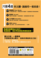作者整理出英語聽說的四大技巧:關鍵單字、輕重音、句子語調、連音,再針對台灣人對英語聽說的排拒心理,制定28天黃金學習表,由最簡單的抓取關鍵字入手,一直到最不容易掌握的連音技巧,由淺入深、循序漸進的學習,一週只需學會一個技巧,加上一週七天的反覆練習,只要四週就能成為英語達人!