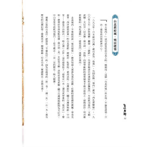 ✽台北老街擁有暢銷書與長銷書的雙重美譽,全新增修版本,換置多張史蹟照片、珍藏史料,以及莊永明精心收藏有關台北老街的明信片與愛國獎券。