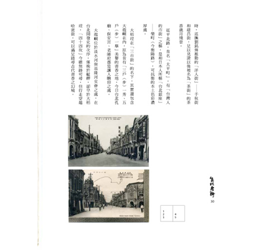 《台北老街》出版至今已有二十年了,原先想讓其「走入歷史」,但不少人希望能重現江湖,可能是想手頭有書的人大有人在,逼得我不得不低頭答應改版,改置老照片,重溫台北老街,重點不僅可再度品讀,更重要的是希望以後深入走訪,畢竟老街沉澱著不少城市的感情與記憶。老街之「道」,有我跡痕,來來去去,與歷史作伴。