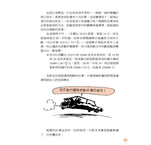 這一系列的套書它不僅兼具數學性、故事性和趣味性,更難得的是它有別於數學教科書循序的邏輯安排,帶領讀者對數學知識有更廣泛、宏觀、統整性的瞭解,讓孩子們對「數學」的看法產生改變,數學不再只是加減乘除、計算與應用題;數學不再是每天寫不完的參考書和測驗卷。本書拓展孩子們對於數學知識的源起、數學與生活及其他面向關聯的視野,而整合的數學視角,讓孩子對數學更有感覺。雖然書中談及如指數、球體體積的算法等看似是國中的數學學習範疇,但是由於能夠和小學的數學知識產生連結,而且文字敘述淺顯易懂,一般而言,中年級以上的孩子都有能力閱讀它。小學生讀這一系列的書,可以從感到有興趣的篇章讀起,如果文中提到沒有學過的數學內容,就跟著看過去,無妨,它不會造成繼續讀下去的困擾。