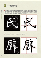 有了前一單元「基本六十二筆法」的扎實基礎,才能進一步瞭解字體中的筆畫安排,以及筆畫與筆畫間的組合概念,我們稱之為「結構原則」。本單元歸類出十七種結構原則,讓書寫者有了明確的原理根據,再依循此原則將每個字寫得勻稱和美觀。