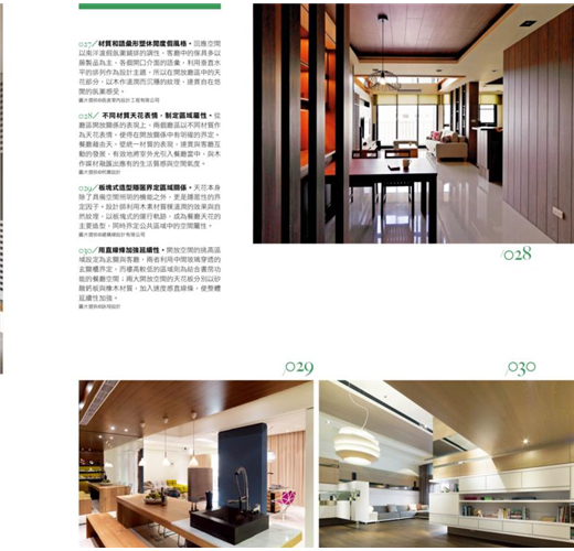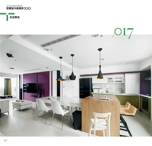 在開放的場域中也需要界定出不同的使用空間,該如何將隔間設計做到隱於無形之中呢?這時可利用天花的拉出造型,或是刷上不同的漆色,甚至利用不同的材質區隔,讓空間層次更豐富。