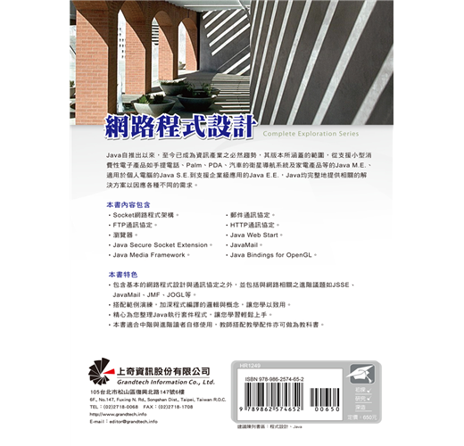 • 包含基本的網路程式設計與通訊協定之外,並包括與網路相關之進階議題如JSSE, JavaMail, JMF, JOGL等。