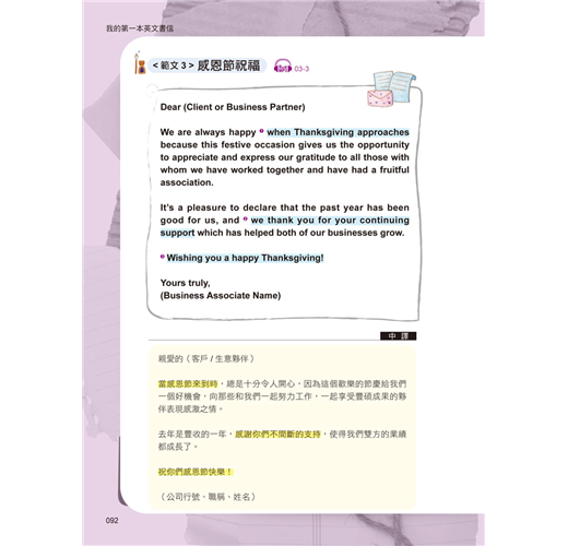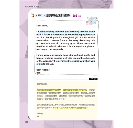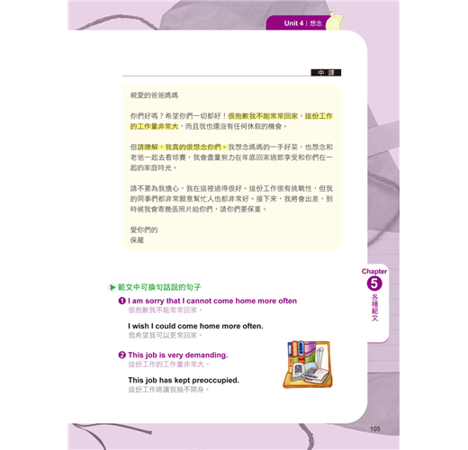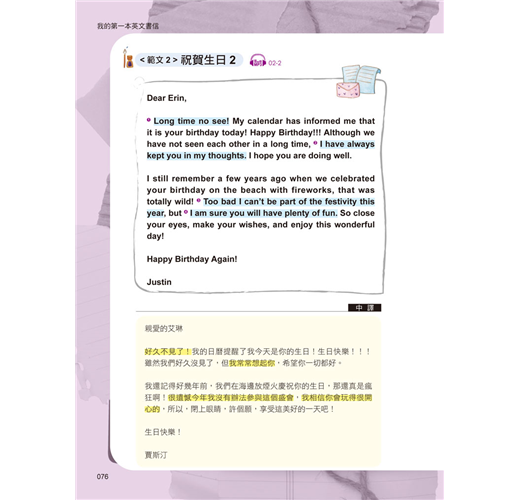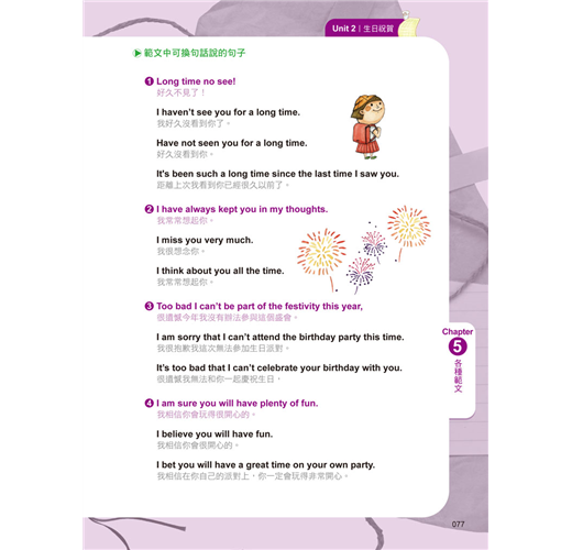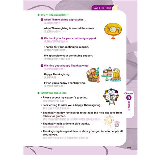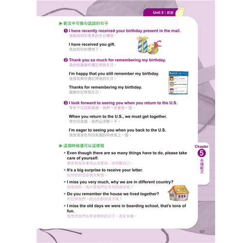 Chapter 5各種範文Samples Unit 1 分享消息 Share news Unit 2 生日祝賀 Birthday Greetings Unit 3 節日問候 Holiday Greetings Unit 4 想念 Miss Someone Unit 5 感謝 Appreciation Unit 6恭賀 Congratulations Unit 7 慰問 Solicitude Unit 8 網路購物 On-Line Shopping Unit 9 邀約 Invitations Unit 10 聯絡舊識 Reaching Old Friends Unit 11 商業信件 Business Letters
