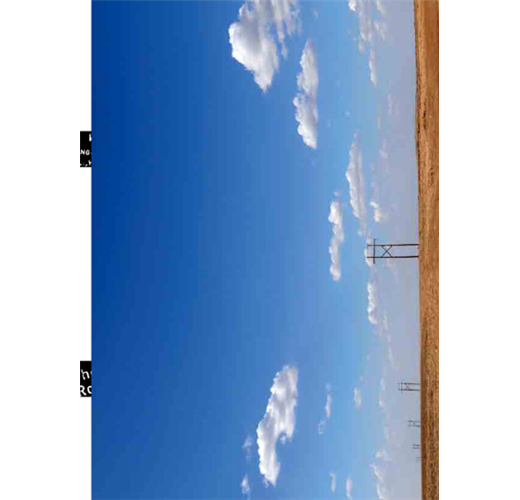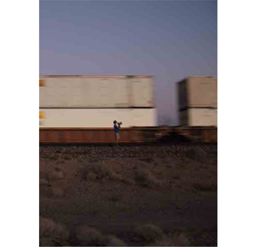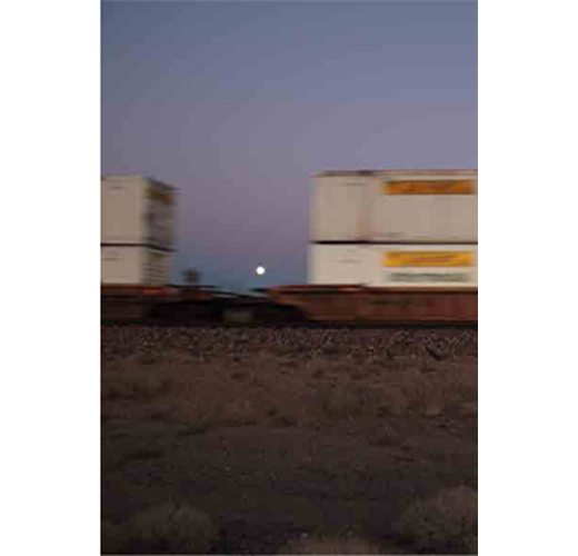 在雙手幾乎沒有移動方向盤的情況下,車子又向前行駛了五十英哩。今日一路伴隨我們的貨運列車無預警地停駐在沙漠中央,柴油引擎仍然發出巨大的喘息聲,像一隻宮崎駿的動畫《風之谷》中藍色眼睛的溫馴王蟲,靜靜等待下次移動的信號。
