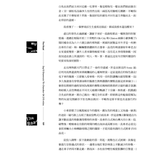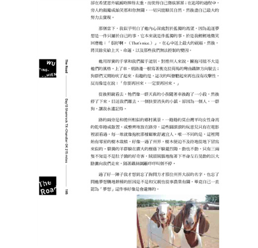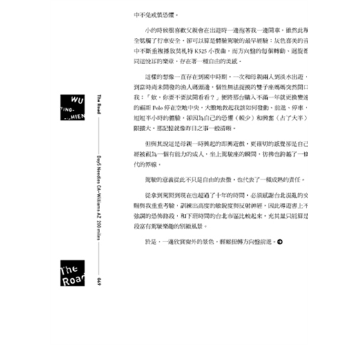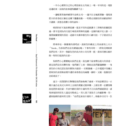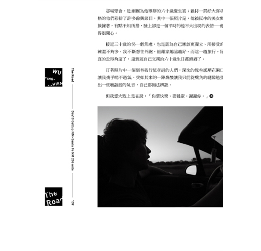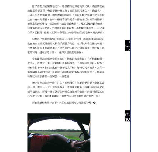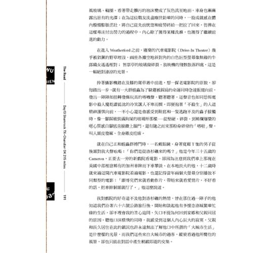 路途上,沒有恐懼與不安,即使孓然一人在這空曠孤絕的環境,全身上下卻被一種無拘無束的自由感以及被棉被緊緊捆住的安全感包覆著。作者藉由自己的既有認知來認識新環境,旅行打開了感官,也啟動了回憶的程序。對他來說,這不單只是一趟公路之旅,而是尋找隱藏在自己身體裡的元素:家人、朋友、所生所長的土地、以及有點熟悉卻不大了解的美國……這是一趟找尋自己的旅程。