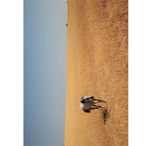 路邊突然出現一大片廣闊的草原,陽光將枯草照得金亮,草地的盡頭和地平線合而為一,將視野一分為二,成為兩塊純淨的湛藍與金黃。一匹白馬從遠方穿過草原朝我們走來,成了金磚上最閃耀的亮點;雖然白馬上沒有王子,自己也不是尚懷著公主夢的少女,但白馬緩緩移動的這一兩分鐘,就彷彿侯孝賢電影中常用的長鏡頭般有種將人凝結的震撼。白馬在我們前方來回走動、吃著草,像是模特兒一樣在我們眼前搔首弄姿;另一頭棕馬沒過多久也悄然出現,兩匹馬用臉相互磨蹭,不曉得彼此交換了什麼秘密?然後,像說好似的頭也不回往遠方奔馳而去,消失在草原的盡頭。