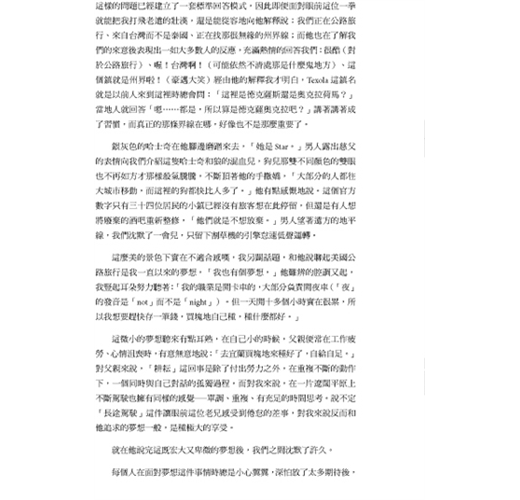 那塊車牌被沙塵蒙蔽,是深刻在心裡的記憶讓那組車牌號碼顯得清晰:444-1020;左前車窗早已打開,是為讓自然風吹拂拭去車內的煙草味。此時父親必定將左手肘靠在車窗沿、食指輕觸上嘴唇,單留右手掌控著方向盤,在這筆直的道路上,這麼做一點都不危險。那是一種專屬於他的率性,而我永遠也學不來。