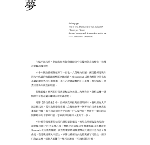這不只是一趟公路旅行,這條路上,將拜訪組成「吳定謙」這個人的許多成分:小學隨父母工作來美而在當地求學、成長、結婚生子的表哥表姊、大學畢業後赴美攻讀研究所的同學、年輕時來此闖蕩的姑姑姑丈與在美國生下的第二代,以及國中時來美且將誕生下一代的表姊……這些人怎麼看美國?怎麼看台灣?怎麼看這些歷史?作者將從西岸往中部的芝加哥,逆向探尋這條路的源頭,繼而續往東至大西洋岸的華盛頓,最後抵達紐約,完成一趟「美國夢」的旅程。
