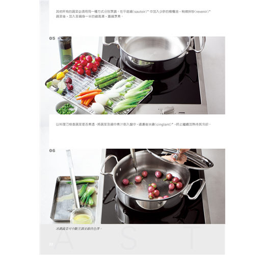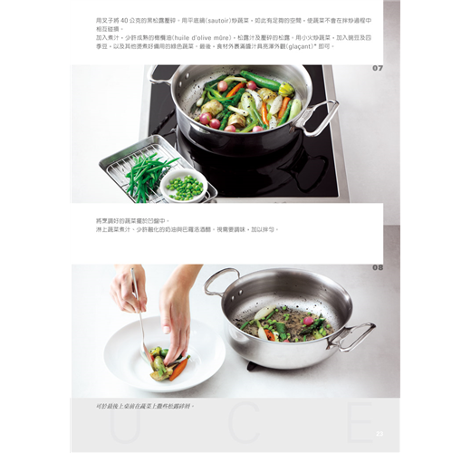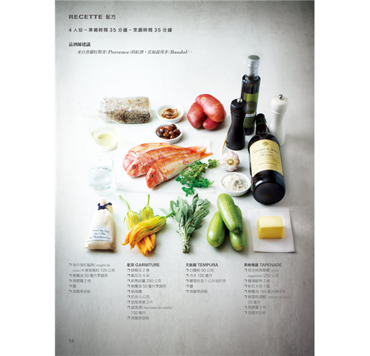 每一道菜餚除了完整配方外,更有材料圖、主要材料照片,以及詳盡的步驟圖片與解說,並附上佐酒建議和創意變化,以及:專有名詞GLOSSAIRE 書中詳細介紹各種料理製作的專有名詞,例如:什麼是BRUNOISE切細丁?JULIENNE切絲?GLACER表面覆以光澤?ÉCUSSONNER去雜葉以及INFUSER浸泡?…等等,讓您更清楚瞭解專業料理的細節與風貌。