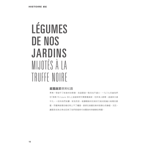 這系列小書找來當今法國最具代表性的餐飲人物 – Joël Robuchon、Pierre Hermé、Jean-François Piège、Thierry Max...等 - 每本書呈現每位主廚十道經典菜色的作法。大師之最,簡單而高明,清晰而入裡,堪稱經典裡的精髓。