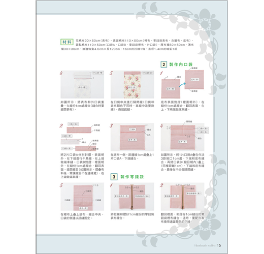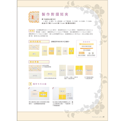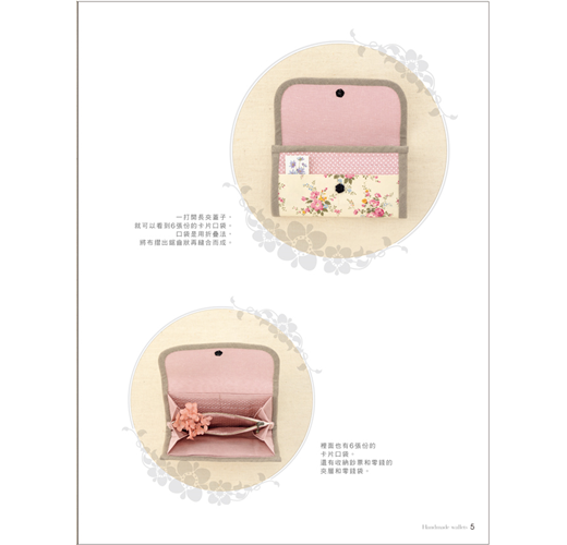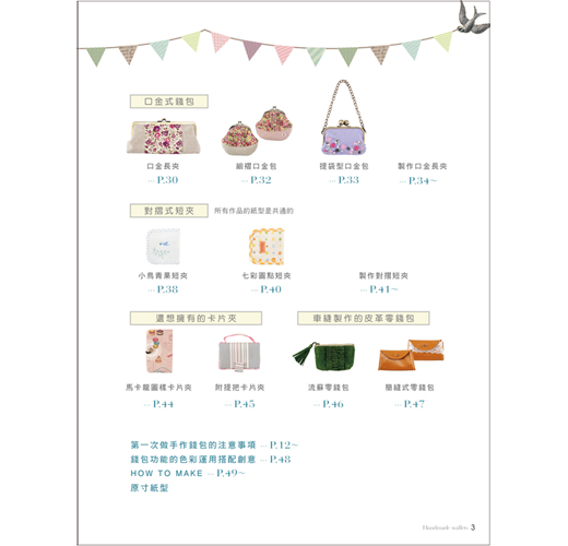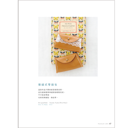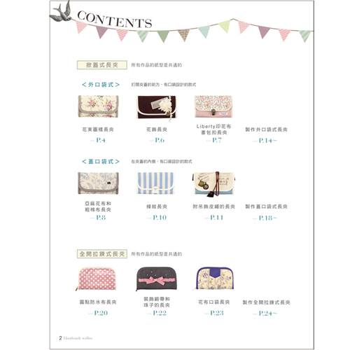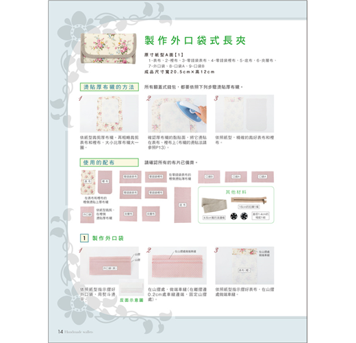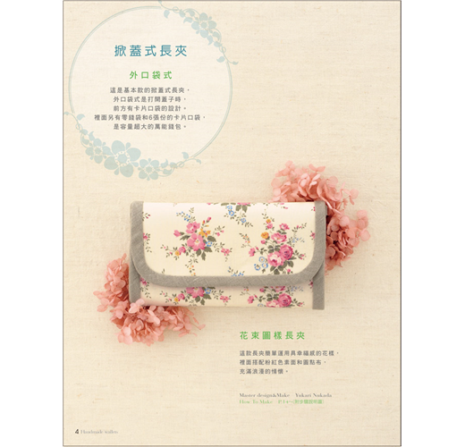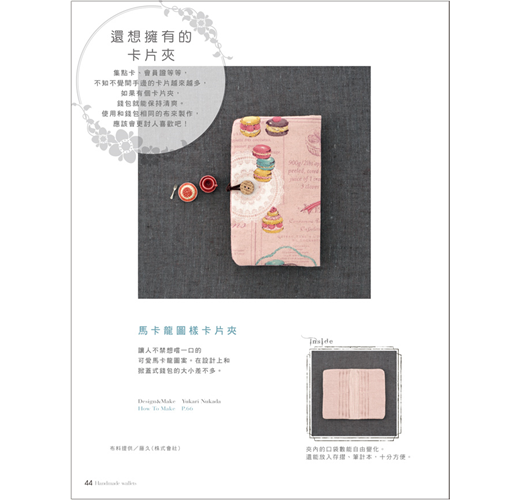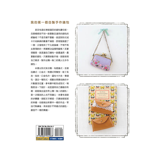本書以形式來分類,有掀蓋式、全開拉鍊式、口金式、對摺式等類型,除了長夾、短夾、口金包外,還有卡片夾、零錢包,選定一種形式,規劃出想要收納的卡片數量及位置,參考書中配色或型式,稍微更改一下設計,或是選用自己喜歡的布樣,就能做出這世界上獨一無二的錢包。第一次嘗試的人也不用擔心,本書有清楚的步驟圖,搭配文字解說,只要按部就班的車縫,也能做出和書中一樣的作品,等技巧熟練後,再來設計不同樣式的錢包,創造不一樣的樂趣。