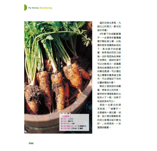 只有自己栽種的蔬菜,才能安心的煮給家人吃,不用擔心農藥問題。作者因為健康緣故,開始栽種蔬菜,而且意外發現,自己栽培的蔬菜有一種旺盛的生命力,即使存放多日,也完好如初!在颱風過後,菜格飛漲的時候,更是發揮最大效益,而且在栽培過程中,伴隨的豐收和喜悅,更是無價的快樂。
