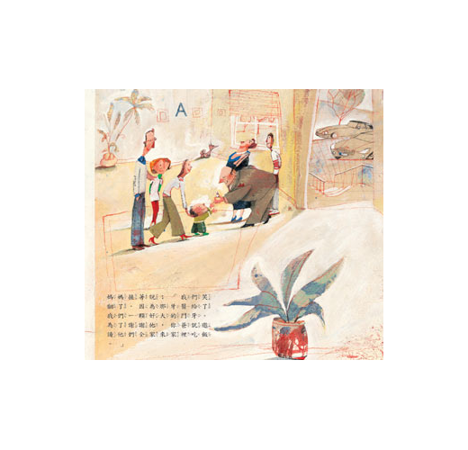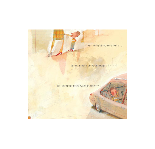 繪者善於靈活的運用媒材,表現手法大膽又自由。在本書的插畫裡,他使用各類的紙張,如牛皮包裝紙、報紙、格線紙等,結合拼貼的方式做為基底,並在其上施予厚彩,顯現肌理的變化,部分則露出紙張的字體與紋樣,增加視覺效果。在人事物造形上,他採取誇張、變形的呈現,配合畫面多角度的空間處理,營造出特殊的韻味。
