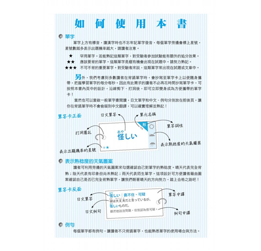 記住越多字彙,不只能提高文字‧語彙分數,在聽解、讀解‧文法的分成績也將直線上升。只要努力多背單字,就能越接近日檢合格之路。