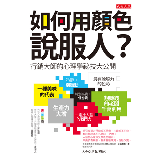 每年指導兩百多家公司的行銷與廣告心理學大師小山雅明,要告訴你:人類的經濟活動一直受到「顏色」影響,我們的工作、消費,乃至於生活,更是天天被顏色制約,只是我們幾乎察覺不到。懂得運用顏色帶給人的心理暗示,可以增加你的工作能力,增強你對客戶和同事的說服力,讓別人不知不覺隨著你的意願行動,成功行銷商品以及自己。